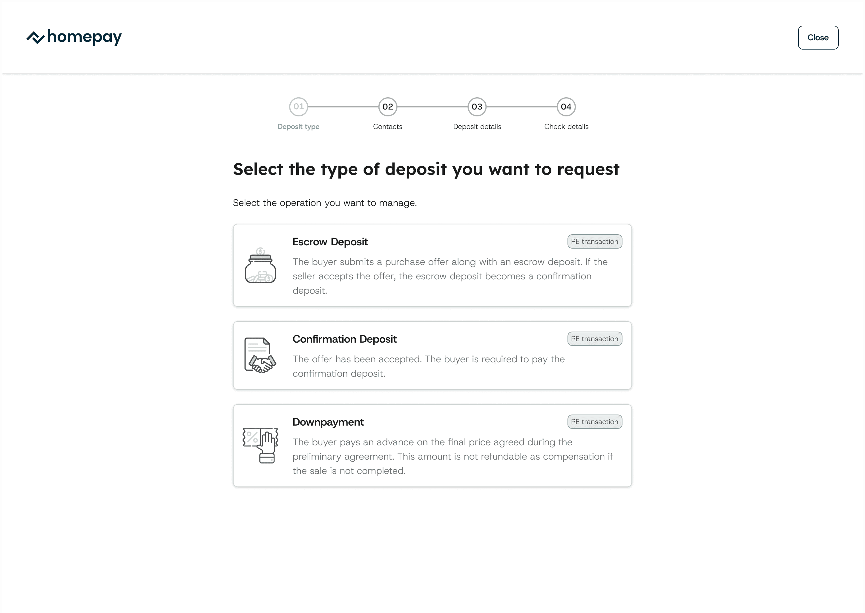 Choose the type of deposit, enter the buyer's details, and send the payment request in just a few clicks.